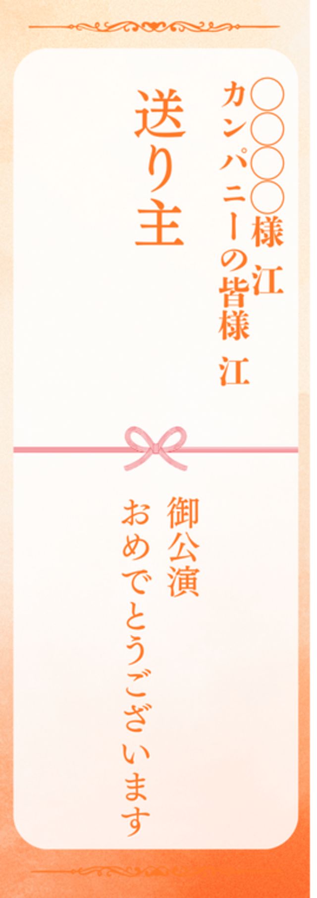 <<『お差し入れ札』について>> 本公演ではプレゼントやお手紙、お花の受け入れを辞退させて頂くこととなりました。 辞退に伴い、プレゼントやお花の代わりにキャスト様等へのコメントが送れる【お差し入れ札】をご用意致しました。 お申し込み頂いたお代金は、劇場入り後のお弁当・ケータリング等に使用させていただきます。詳細は下記をご確認ください。 詳細は下記をご確認ください。 ○《お差し入れ札》小:¥3,000-/中:¥5,000-/大:¥10,000- <<受付締め切り>> web受付 → 2025年12月27日(土)23:59 ++++++++ お申し込み頂きましたお客様のお差し入れ札を、公演期間を通して楽屋スペースに掲示させて頂きます。 (デザインは商品画像をご参照ください) ※お申し込み時に【ご注文者様のお名前】【ご希望の宛名】【応援メッセージ】をお選び、またはお 書き頂きます。 ※お名前やメッセージは、必ず注文時の【各記入欄】にご記入ください。 ※掲示場所は会場の都合などで変更になる場合がございます。予めご了承ください。 +++ご注文方法(以下を各記入欄にお書き下さい)+++ ①ご注文者様のお名前/御社名 等(ニックネーム可/一行10文字程度まで入ります) ・ご指定の記載が無い場合は、購入者情報に明記されているお名前を使用致します。 ・文字数により文字の大きさは変更させていただきます。 ・ご利用になれる記号は「!」「☆」「♪」「♡」のみです。 ②お宛名/応援キャスト名 ・ご希望のキャストをお選びください。(選択式)+「カンパニーの皆様」の表記で統一させてい ただきます。 ・キャスト宛以外(団体・スタッフ等宛)の場合は備考にお書きください(一行10文字程度まで 入ります。) ・特にご記載がない場合は『カンパニーの皆様』宛のみの表記させて頂きます ・応援キャストは1枚につき1名まで。 ③ 応援メッセージ ・札の下部にお入れできます ・1行10文字程度・最大30文字まで ・アルファベット表記は横書きでご対応可能です ・文字数により文字の大きさは変更させていただきます。 ・ご利用になれる記号は「!」「☆」「♪」「♡」のみです。 《注意事項》 ① 掲示の順番や場所などは指定できません。こちらで調整させて頂きます ② ご購入頂いた札はお礼といたしましてSNS等で掲載される場合がございます。写真NGを希望の方は【写真・SNSの有無】で「写真・SNS【NG】】をお選びください。 ※②でNGがない方は「選択なし」のままでお願い致します。 ※販売サイトの仕様により、御祝符を作成後、発送通知が送信されますが実際には発送されませんので予めご了承ください。