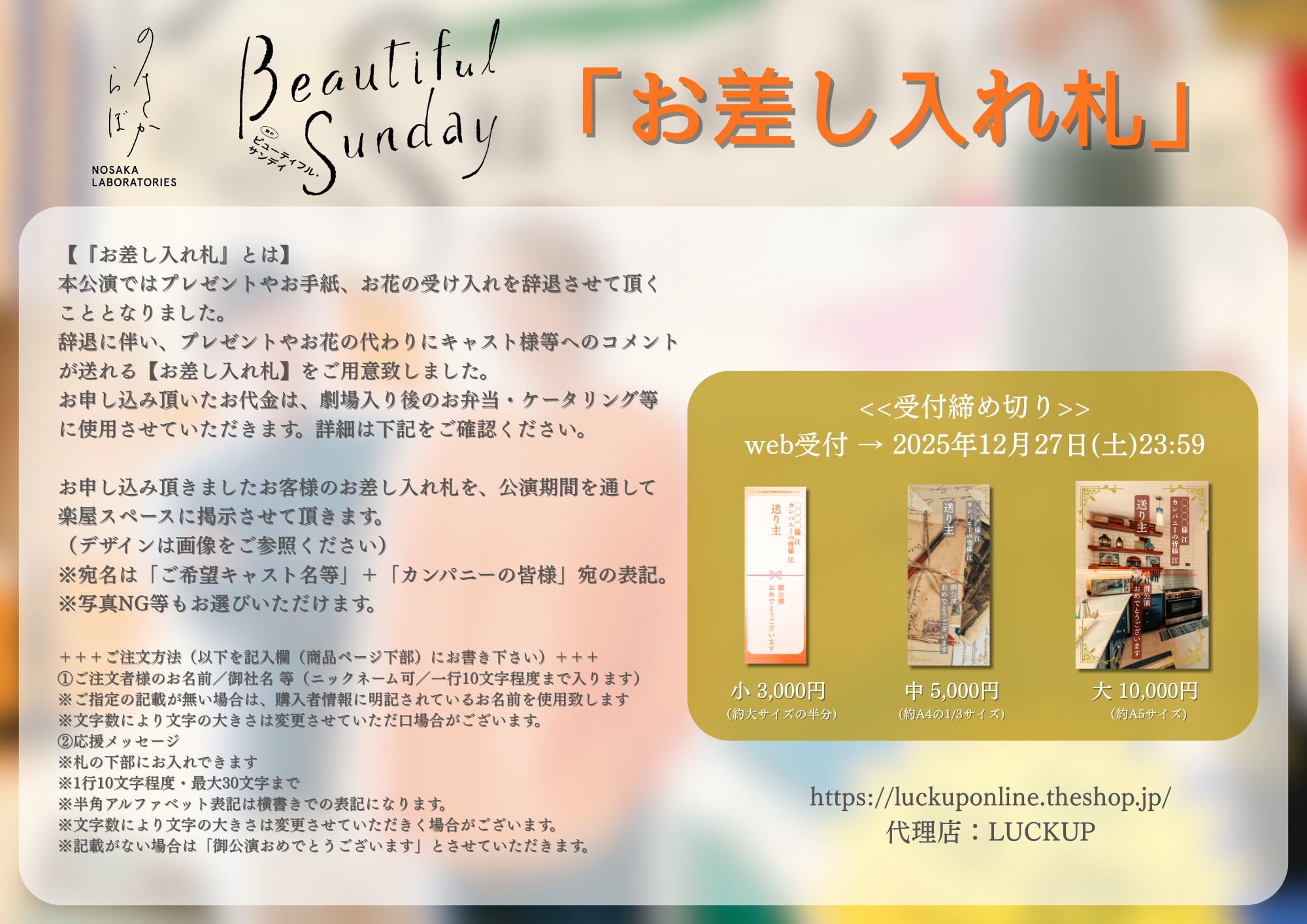 お申し込み頂きましたお客様のお差し入れ札を、公演期間を通して楽屋スペースに掲示させて頂きます。
